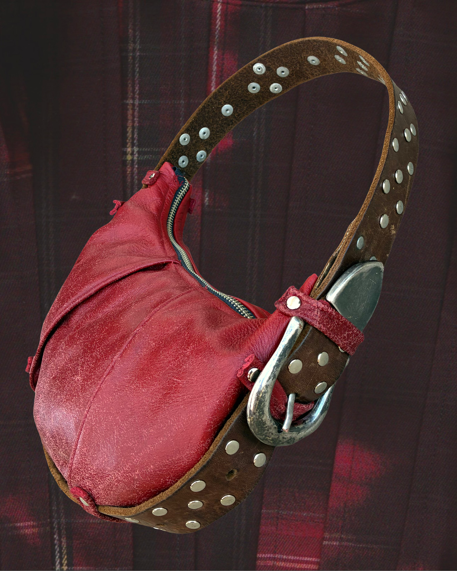 SADDLE BELT BAG IS MADE WITH LEATHER OFFCUTS AND VINTAGE STUDDED BELTS